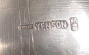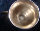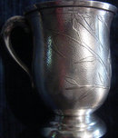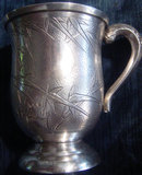 This elegant footed silver cup, of exquisite design and fine weight,is in beautiful condition and bears the hallmark of Yenson, along with two other Chinese marks of high purity. On the central band, graceful bamboo branches float against the night sky, the full moon providing a space for engraving -- never executed on this piece. Approximately 3-1/2 inches high and 3-5/8 inches across at the handle.