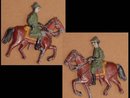 As you can see by the dime next to this old pot metal horse and soldier this is not large ( 2 1/2" x 2 1/2"). He is dimensional and two sided. I am not sure what type of soldier he is so if anyone wants to contribute to this description please feel free to email me. I just know he is old.