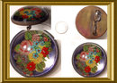 This is a reverse painted GLASS Antique rosette that was converted to brooch prior to the 1900's. Many of these were lost or broken and you don't usually find ones with flowers so this is a real beauty. The deep cobalt blue background really sets off these pretty flowers. This is 2" long and has its original latch on the back.