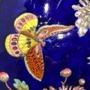 Our unusual lamps in the Aesthetic style are crafted from large ceramic vases with colorful and exotic images of birds, butterflies and flowers. Wooden pedestals and brass lamp hardware added later. In need of new wiring. Each approximately 9-10 inches across and 31 inches tall.