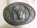 Outstanding Metal South Western Belt Buckle with a Cow Skull with feather design. This is so very cool. The condition is excellent. The metal has a pewter tone to it although I am doubt if they actaully used pewter since that metal is too soft. It marked and dated on the back 1991 Sikiyou Buckle Co. Inc. Asland Oregon. Plus is is numbered D-5.
