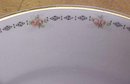 This is a nice set of china dishes with a nice floral (rose and leaf) design ring around the near edge of each plate, cup, saucer, and the same with the serving dishes that are included. All are the same pattern and all have the gold trim ring also. The set has (6) tea cups, (11) saucers, (12) 6" plates (12) 7" plates, (12) 9" plates (1) 12" platter, (1) 9" covered dish, and (1) 9" oval serving dish. All are marked "CROOKSVILLE CHINA" on the bottom. All are in useable condition, all that minor crazing, mostly on the undersize, and we note the cover of the covered serving dish has a tight hairline crack with a little bit of darkening around the crack in the glaze. We note that there are some plates that have minor, tiny specks of the gold missing off them on the trim ring around the outside, not bad. A nice looking set with are small rose pattern on them! We also have a nice selection of silver plate flatware set and single piece to decorate your serving table!