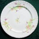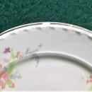Crooksville China's "Spring Blossom" pattern plates, made in 1939. Small violet & pink flowers with gold edge. Marked as shown. Measure 7"d, dessert/pie plate. Generally nice condition with only 1 small chip to edge of one plate as shown. Slight wear to gold edging and crazing of the glaze. Sold as is, and as a set of 8. Inglenook Antiques...Established 1989.