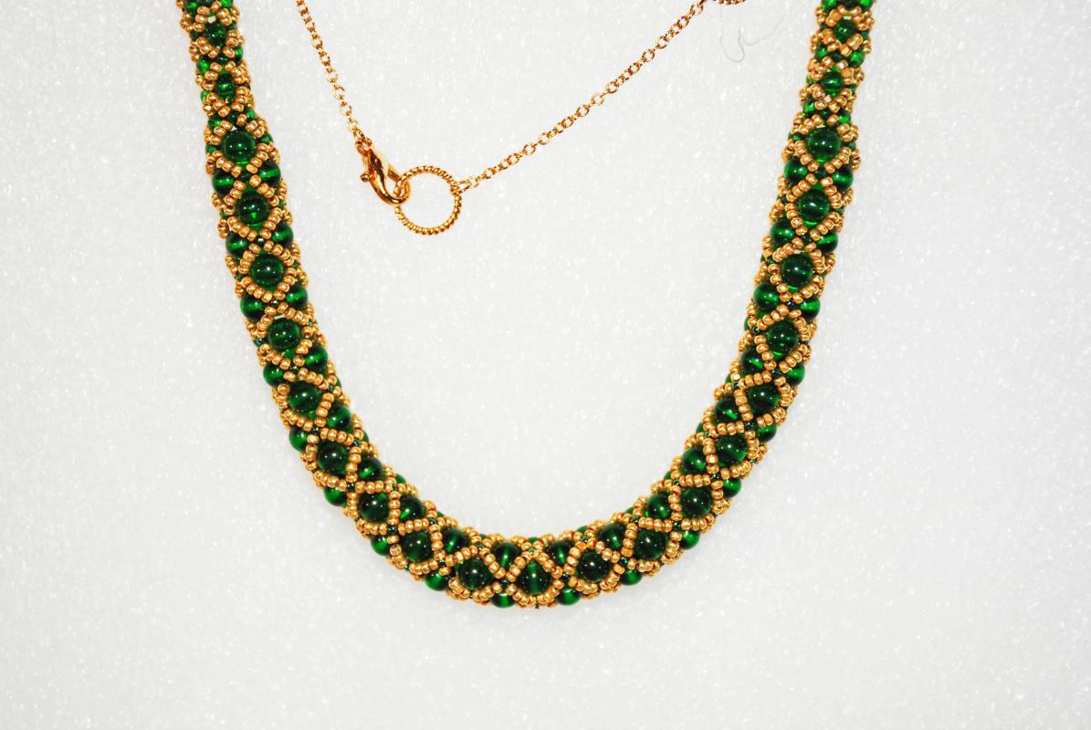 Czech Beaded Netted Rope Necklace, Green and Gold One of a Kind Original Designer