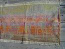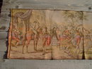 Depression Era colorful French Baroque or English Colonial style dresser scarf decorative wall linen tapestry. Dancing Gentleman beautiful ladies adorn an architectural street scene with water fountain backdrop. Decorative piece measures 55 inches long, 18" high.