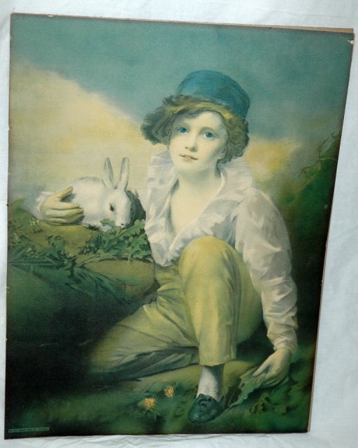 "Deaf Boy with Rabbit" by Sir Henry Raeburn, Scottish artists (1756-1823). This is 1925 print by Borin MFG. co. Chigaco. It measures 16" x 12". The condition is good. It has a tiny tear on the top that would be hidden by the frame anyway. And the right top corner is a tiny bit tattered but that too is hidden by the frame. It had in a framed . I decided to sell it without the frame because I broke the glass and use the frame for something else.