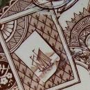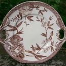 "Louise" handled cake plate, with aesthetic "Japonisma" decoration of birds, flowers and ships, in brown transfer print. Made by Wedgwood of England, registered April 8, 1881. Measures 10 3/8" handle-to-handle. Has allover crazing and an extra bit of glaze, but no chips or cracks. Sold as is. Inglenook Antiques...Established 1989.