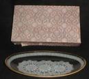 Doily stenciled relish dish with gold trim. This glass relish dish has a stenciled (probably machine not hand) design with a heavy gold trim. It has it's original box but it is in poor condition. I was told by the owner of the bowl that it is pre 1940, but it appears newer to me. If you can shed some light on this please email us. The box appears to be from the 1920's or 30's.. The bowl definitely hasn't been used, just carefully stored away. 9" x 5 1/2, mint condition.