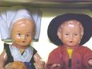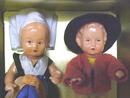 Offering this vintage pair of miniature celluloid dolls still in their original box! Both have moveable arms and legs; the boy is wearing a black felt hat, red felt jacket with teeny black buttons, a yellow shirt, black cumberbund and tan pants; little black shoes are painted on. The girl has a white headress, black taffeta dress with blue apron that has white and orange ribbon trim, painted black shoes and white socks. Face painting is very nice. Each measures 3 inches tall, like new condition, no holes or stains, no cracks or wear. They come in a small gold box with clear plastic lid. They are still attached to the original gold card. No makers marks, but look to be most likely German, circa 1940-50's. Darling little miniature dolls for your collection!