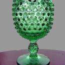 Vintage Duncan Miller green hobnail glass footed bowl vase has a very nice shape to it, beautiful crimped or pinchedruffled top edge, and a footed base . The color of green has a slight blue pine tint to it. It measures 7 3/4” tall, by approximately 4 1/2" at its widest points. It is in excellent condition, and has no chips, cracks, or damage. Very nice piece for use or a collection! This is a fairly heavy piece to begin with, so shipping is based on 3 pounds packed weight.