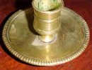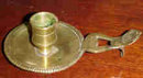 Wonderfully sturdy but with a delicate air is this lovely chamberstick, French. mid-Eighteenth Century. The base and candle cup are almost identical to Figure C on page 205 of THE BRASS BOOK by Peter, Nancy and Herbert Schiffer (1978, Schiffer Publishing Ltd.), but the shell-decorated handle is pierced and counterbalanced with a finger hold underneath. Excellent condition, approximately 7-1/2 inches long by 3-1/4 inches wide and 1-3/4 inches high.