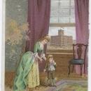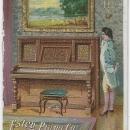 Victorian Fold Out Trade Card for Estey Piano Co. New York. On the Front of the card is a Mother and her Son with a Piano Teacher, The First Music Lesson. Inside of Card has Information. Card is 5" high and 3 1/2" across. Card is in good condition, wear at edges, Light glue stains inside.
