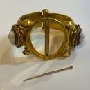 Our Archeological Revival gold bracelet features a large (2 1/2 inch) hardstone cameo in center that may be removed and worn as a brooch, and two smaller cameos to each side, each also affixed via removeable pin to allow their wear as pins or earrings. Apparently unsigned. Inside diameter is 6 3/4 inches. The area underneath one of the smaller cameos appears to have the impressed mark of a seashell, the French small guarantee mark first used in 1838 to signify .585 gold purity, known as 14 ct.