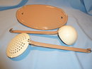 Very nice vintage European graniteware wall hanging kitchen utensil three(3) piece set. The wall hanger and utensil handles are done in taupe and the utensil dipper and skimmer are done in lighter tan. The wall hanger measures 12 inches wide and 7 inches high. This set is in very good plus condition with minimum wear utensil pieces and no wear to the wall hanger. As shown in the photos there is a matching collander listed separately. We are happy to combine items for shipping when possible.