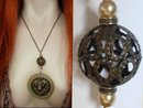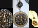 With the sun radiating behind her, this art nouveau goddess reigns as queen among all others as she hangs from this beautiful earthen colored pendant. The Large antiqued brass cage bead above her holds two pearls in a soft golden color, only to be accented by small ornate banded rings. The antiqued brass neck chain measures 28" long and the pendant an additional 4 1/4"(includes the cage ball). WOrn with most any piece of clothing, this will be something that draws people to you with her special charm. In great condition. Vintagesparkles offers layaway on all our pieces regardless of which site it comes from. PLease remember that vintage & antique items are not mint, nor are they perfect but they sure are full of old history and charm.Please use photos to make your decisions and put a little vintage sparkle in your life!Remember that old glue and hot post offices may cause some stones in vintage pieces to loosen in shipping