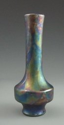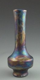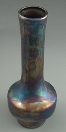 Wonderful antique Clement Massier art nouveau stoneware pot, c. 1900, columnar and elegant in form covered in a myriad color iridescent glaze, predominately purple, indigo, gold, silver, green and black. It is in excellent condition and is hand-incised, "CMH", on the bottom. Please write with any questions you may have.