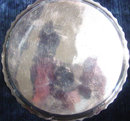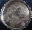 This top-quality serving tray from noted Hong Kong silversmith Wang Hing is in excellent condition with almost no signs of wear. A finely engraved dragon-in-clouds circles around the center an attached high-relief pie-crust border. Approximately eight inches in diameter and a half-inch deep.