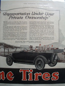 Firestone Transportation Ad 1918 this is a August 17, 1918 advertisement. It is a nice two page color ad from Firestone. Ad shows a huge tire. Under the arch of the tire in the background is a line of telephone poles. A train where all the cars are red. A red vehicle down the road. Very different from todays ads Ad reads, transportation under your private ownership. New features which add life strength and general efficiency have been worked into Firestone Fabric Tires through experience gained in Firestone Cord Tire construction. In mint condition. Photo is taken through plastic and may show wrinkles or crookedness that is not in the ad. This original magazine tear sheet measures 10 1/2 inches wide by 14 inches tall.
