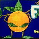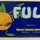 Florida citrus label from Waverly Growers marked "Full", showing an anthropomorphic orange on a dark blue background. These are original unused labels, printed in the 1930's, tested under ultraviolet light. There are no brighteners in the paper, which came into wide use in the late 1950s. Measuring 4.5" x 9". In generally very good condition, though may have slight imperfections, occasional edge tears or folds. Best ones sold first. Backing is slightly reflective, but can't say if it's gummed without dampening it. Some tanning of edges visible on back. Sold as is. Printed by Bandau Craig Dickerson Co. of Nashville, Tennessee.