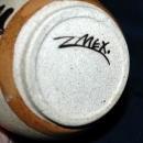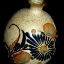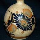 Folk Art Tonala Stoneware with Enameled Flowers Bud Vase The condition is excellent. It has an unusual shape like a bottle with a small neck. It measures 6" tall and is marked Z Mex on the bottom,