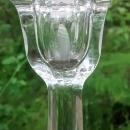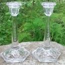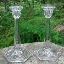Fostoria single-light candlestick pair #1963 in clear glass with wheel-cut leaf sprays. Hexagonal foot. Dates from 1914-1928. Each measures 9.25"h. Nice condition with no chips or cracks. Inglenook Antiques...Established 1989.