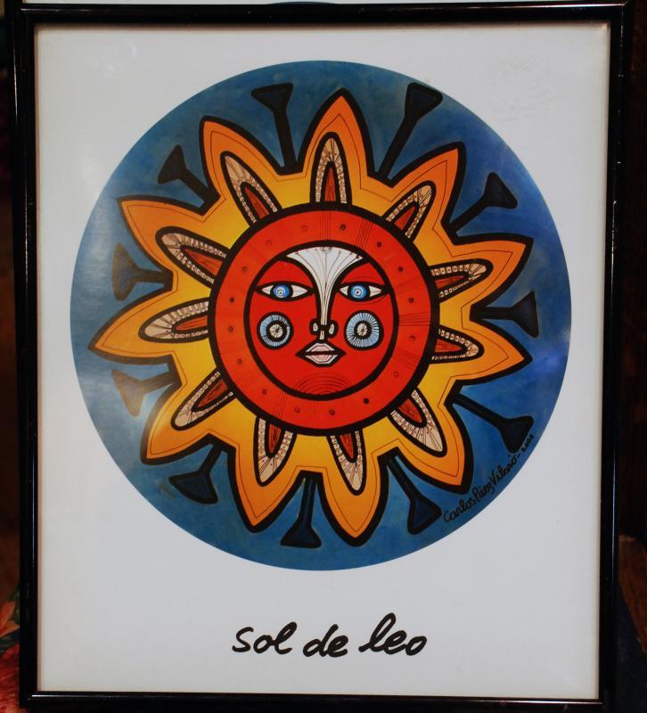 Framed Art, Sign of Leo, from the series Suns of the Zodiac by Carlos Páez Vilaró ( 1923 to 2024) of Uruguay . This is a print of a painting by this famed artist from Uruguay. He pained a whole series for the zodiac calander all themed with bright beautiful Sun faces. Plus he has done installations world wide.