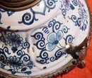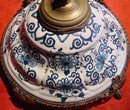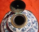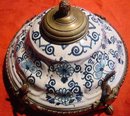 Incorporating what must have been the lid a large 17th Century jar of Rouen faience, this handsome French inkstand is mounted in finely detailed antiqued bronze. Dating from around 1870, it is approximately 8-1/2 inches in diameter and five inches high. It is in excellent condition.