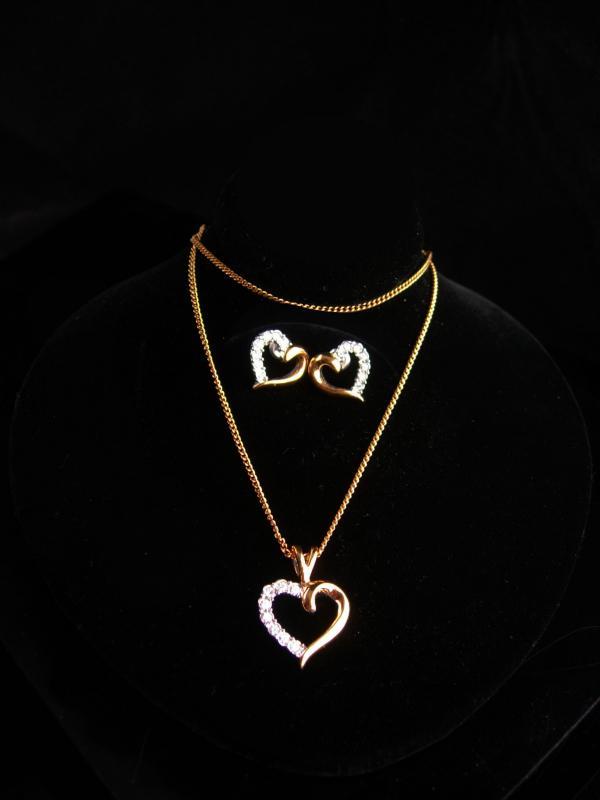 This is a two tone set earrings and necklace silvertone and goldtone with faux diamonds ( cz's ) on one side of the hearts. . The costume necklace chain is 18 inches long and the earrings are for pierced ears. Great for a bridesmaid, wedding, valentines day or anniversary.