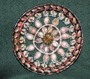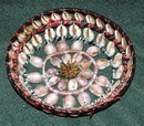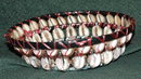 Pretty hand made basket of cowrie shells. It is kind of funky as it is held together with recycled plastic fibers. The center appears to be of wicker. I don't know what the rings are made up of. It is surprisingly heavy