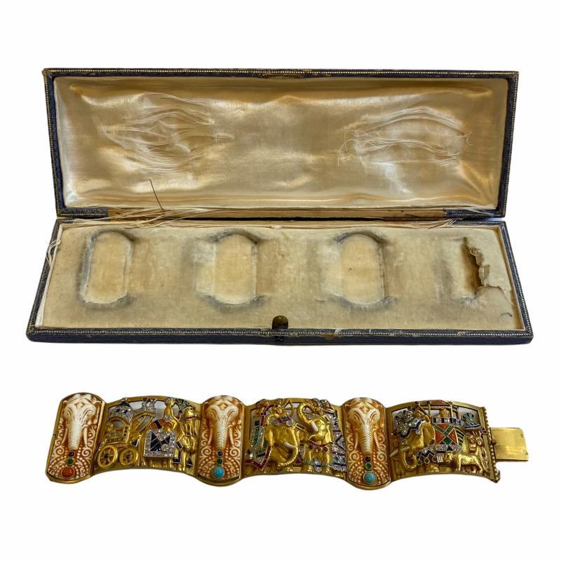Our magnificent 18K gold, gem-set and diamond bracelet, attributed to the legendary Barcelona jewellers, Fuset y Grau, circa 1930, features a ceremonial Indian procession of elephants, exotic animals, royalty in carriage. It has three chased gold openwork panels decorated with a variety of calibre-cut colored stones, including sapphires, rubies, emeralds, cora, turquoise and onyx, plus small round diamonds, divided by three elephant heads carved from bone, and studded with colored stone cabochons at the base. 1 3/4 in (4.4 cm) wide and 7 3/4 in (19.7 cm) long . In its original gift box measuring 9.75 by 3 by 1 in (24.8 by 7.6 by 2.5 cm).