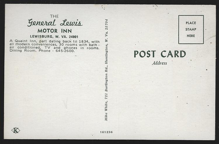 Postcard of General Lewis Motor Inn, Lewisburg, West Virginia. A Quaint Inn dating back to 1834, 30 Rooms. Back of postcard is unused. Postcard is in good condition, wear at edges