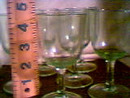 A very pretty set of small stemed glasses. They are in excellent condition. There are no visible cracks or chips that I can see. There are one or two "flaws" that originate from the manufacture of the glasses. One is an air bubble,close to rim of one glass. The bowl of the glass is aprox. 2" X 2 1/4". They stand aprox. 4 3/4" tall.
