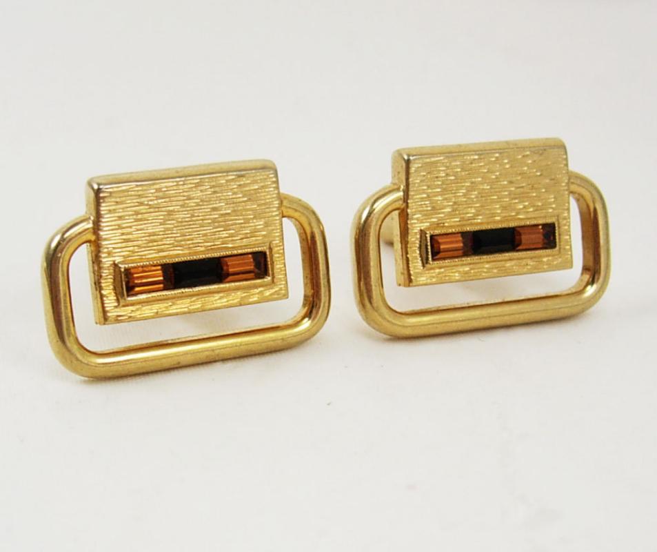 Gold Cuff links * Vintage Buckle Cufflinks * Black Yellow Topaz Baguettes * Goldtone Brushed Fancy designer Jewelry * Hickok USA