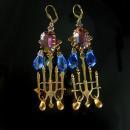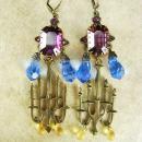Long faceted glass vintage blue swarovski prisms and HUGE vintage amethyst glass stones accent these marvelous eerie candelabras.THe earrings are a whopping 4" long and have frosted glass vintage yellow drops at the bottom of the brass candelabra. Tiny itsy bitsy amethyst rhinestones sparkle thru all the metal work at the top. THe faceted glass tops stones measure 3\/4" long and have vintage claw settings.These are one of a kind and made from vintage and recycled parts to create this vampy set! VintageSparkles offers Layaway on all our Etsy pieces regardless of which site it comes from. Please remember that vintage & antique items are not mint, nor are they perfect but they sure are full of old history and charm. Please use photos to make your decisions and read our policies prior to buying so you can have an excellent experience with us. Please use this number when ordering ga34273 If you want to see more of these pretties this is the link to my etsy store. https://www.etsy.com/shop/vintagesparkles