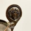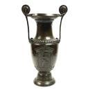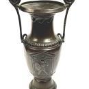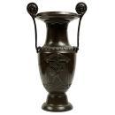 Our client's antique bronze vase dating from the mid to late nineteenth century is fashioned in the style of an ancient Greek volute krater, featuring the figures of warriors and a dark chocolate brown patina. 22.5 by 12 by 10 inches (57.1 by 30.5 by 25.4 cm).
