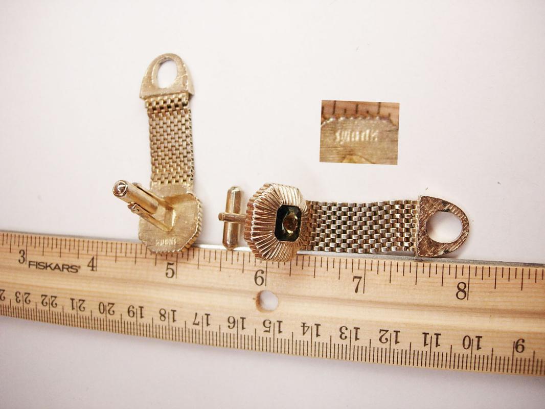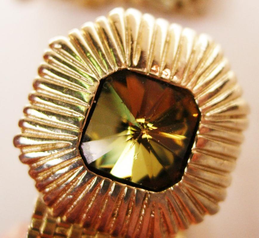 These are a great set of Smoky Green Rivoli Prism Goldtone Wrap Mesh Style of cufflinks. They are truly gorgeous. They measure 3/4" X 2/1/2" and are in good vintage condition. They would be perfect for a fancy night on the town, a wedding party or business. High Quality since they are signed by Swank. cl N9