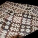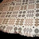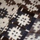 Hand Woven Natural Wool Throw Rug, 42 x 58" Double Sided Flat Weave . Has a lovely abstract geometric pattern . The colors are natural wool of browns, grays and a cream background. The opposite side is the same color Combination but the the dark gray as the background and the other colors make up the design. There is fringe on either end and the rug is about 4mm thick. The weave is tight. Too tight to use as a throw. clean. This in an estate rug that has been kept in a moth proof trunk fo many years. It is free of any damage and is and is clean. Although a good cleaning would brighten up the cream colored wool however it is fine as is. Plus dry cleaning is actually not recommeded for natural wool as it strips away the natural lanolin that helps to preserve the fibers.