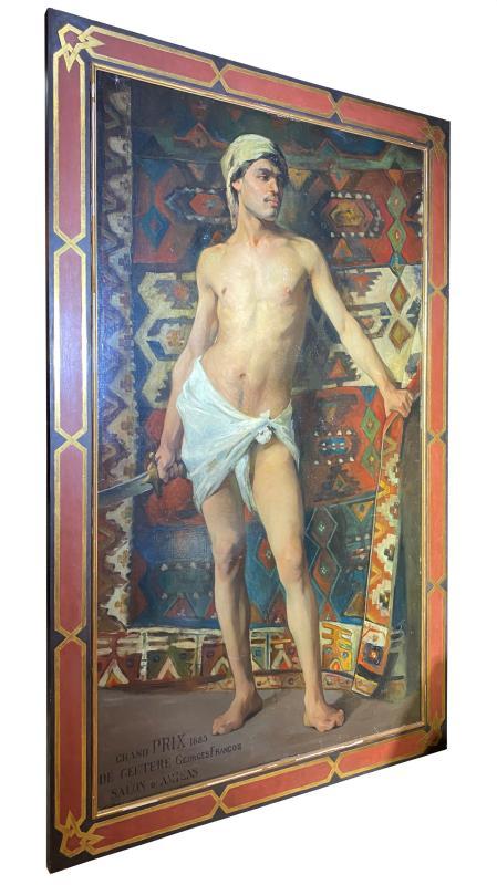 Our magnificent oil on canvas by Georges Francois de Geetere (Belgian, 1859-1929) is entitled The Harem Guard. Stretcher measures 47 by 80 in (119 by 203 cm). Frame measures 56.5 by 89 in (143.5 by 226 cm). Signed and dated Grand PRIX 1885/DE GEETERE Georges François SALON d'AMIENS.
