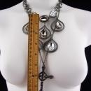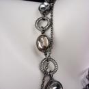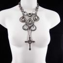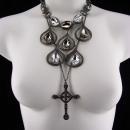Not for the shy, this one of a kind necklace set sparkles in the most dark and mysterious way. A metal vintage huge marcasite cross ( 3" long) hangs from a long 26" gunmetal chain . (So much more detailed and exotic in person ) Large teardrop rhinestones hang from rhinestone teardrop frames on the larger 18" long bib ( 4") necklace. You can wear these separately and get two looks, or together and gethis fabulous gothic look . . One of a kind and dramatic, this will get you LOTS of compliments.