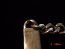 This sterling silver ID bracelet weighs 42.2 gms. The ID part is curved and measures 38mm x 10mm x 3mm, and is marked STERLING on the reverse side. The bracelet has 8 links on one side and 9 on the other, each measuring 11mm x 9mm. At one end, it has a clasp with two arms that fold closed across each other once the ring on the other end has been inserted. This bracelet is in excellent condition.