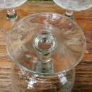 Fostoria needle-etched low sherbets, or champagnes, on stem #114, etch #47. Made from 1900 through 1920. Clear glass, 3.25"h. Some have tiny nicks to the rim, and bubbles in the glass, but no large chips or any cracks. Sold as is, and as a set of 5. Inglenook Antiques...Established 1989.