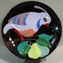 Henriotte studio fused glass Christmas Plate. 1995 first edition, Partridge in a pear tree. Dishwasher safe, Fused glass has air bubbles in it, so it is not microwave safe. Black with shades of purple, green and many more. Hand made, artist designed and signed. 7 1/2" Many hours go into making and designing this type of plate. Very Nice, You can not purchase these at a retail store, only at art studio or show. Mint condition.