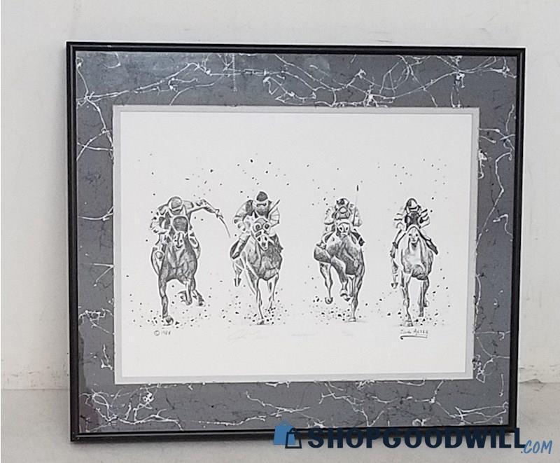 Limited edition print 361 out of 559, horse race, titled "Home Stretch" by John Meier, signed, numbered dated 1988. Professionally framed in a gray metal frame and matted. Sight measure is 13 1/2 by 9 1/2 inches tall.