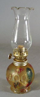 Hong Kong stained glass mid size oil lamp. This is one of the painted bottom oil lamps which has yellow, and blue and red oil stain. If you wash this, do not use amonnia such as Dawn Detergent or Windex or you will have all of the paint off, unless you prefer it clear. They are hard to find with the paint still this nice. There thumprint indentions in the base and a handblown shade. Excellent condtion.