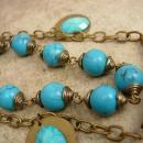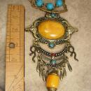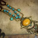 This huge necklace has a beautiful combination of amber and turquoise that really brings a southwest flavor to this huge necklace. A combination of rope beaded loops hold heavy turquoise beads that are accented with an aged brass chain. The pendant is over the top large (5 1/2") long with snake drops on each side. The necklace measures up to 28" long around the back with an additional 6" for the pendant drop. One of a kind this is a really great necklace for jeans or a boho dress.
