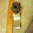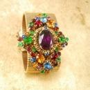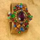 Purple rhinestone pieces are so hard to get so this one with the big center stone is a real treasure. Loaded with color and riveted back stones, this original bracelet with centerpiece is going to make you dazzle the best of them. It is WIDE ( 2") and heavy and really well made. I am suprised it is not signed. The center piece has a czech feel to the filigree bezel. The clasp works well and it has a safety chain to protect it from loss. The bracelet measures 7 1/2" when closed and fits great on your wrist. It has the most amazing colors of reds and topaz and greens and blues. It is a really great quality piece that will be something you can wear with the envy of others.