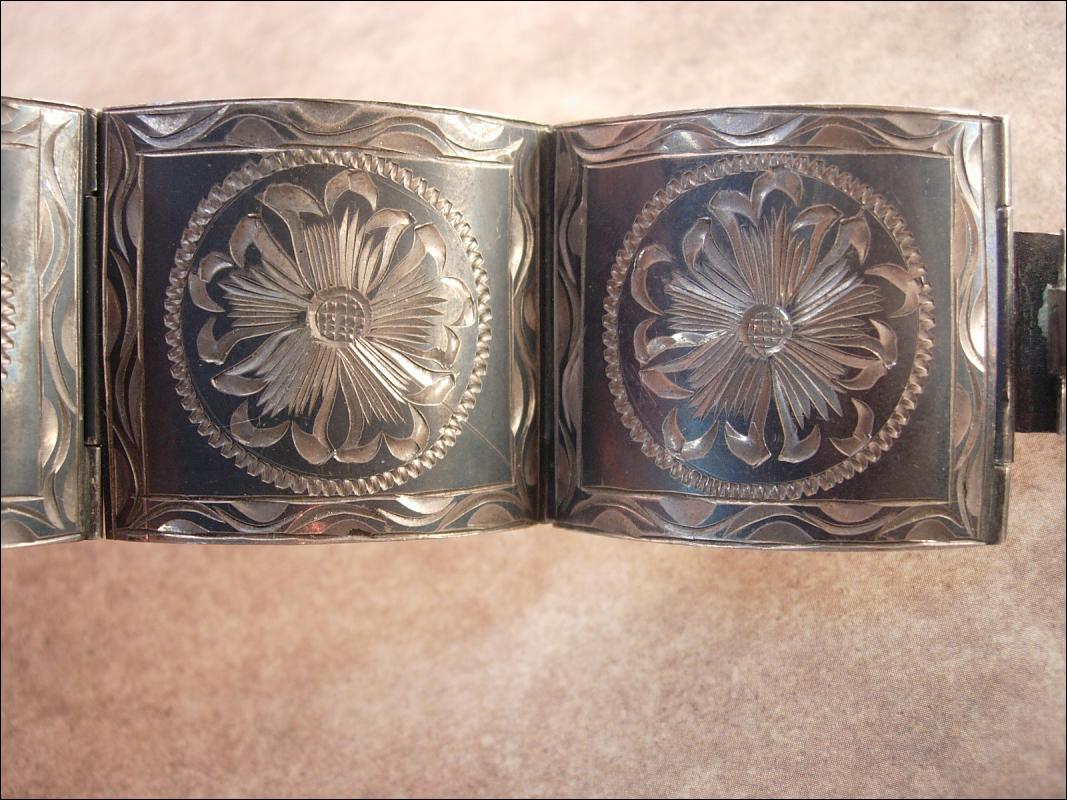 Weighing in at a whopping 74 grams this sterling bracelet is not only heavy and well made but has beautiful flowers on each of the almost 1 1/2" wide panels. THis is not a bracelet for the shy because it is large and heavy and very appealing. This has a crown hallmark and Plata 0925, Guad- Mex on the heavy and well made slide in clasp. THe bracelet is in great shape and has the beautiful niello metal work that really makes these flowers look so Spanish and dramatic! It measures 7" long on the inside and is really thick and has over 2 1/2 ounces in silver in it. Ask about our ten percent off special before you buy, it could save you a lot of money. VintageSparkles offers Layaway on all our pieces regardless of which site it comes from.All layaway payments will need to be in the form of a check or money order only. Please remember that vintage & antique items are not mint, nor are they perfect but they sure are full of old history and charm. Please use photos to make your decisions and read our policies prior to buying so you can have an excellent experience with us.