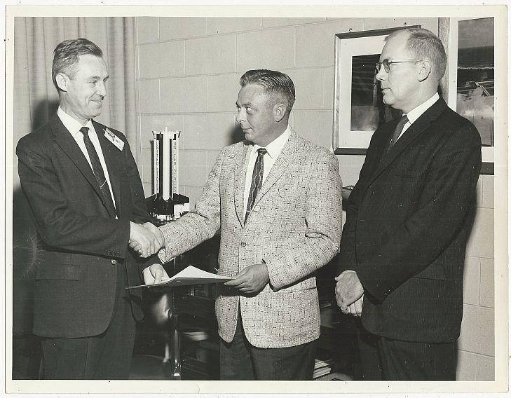 Original Photograph of Three Men at Marshall Space Flight Center, Huntsville, Alabama. Photograph is 10" across and 8" high. Photo is in good condition, slight wear at edges, writing and stamps on back
