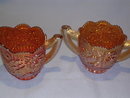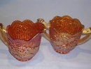Imperial "Pansy" Marigold Carnival Glass Cream and Sugar Set. Incredible luster and color! In excellent condition with no chips, cracks or repairs. Each measures 3 3/4 inches tall. See our other fine pieces of carnival listed separately. We are happy to combine items for shipping when possible.