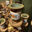 Our silvered bronze and cloisonne enamel mantel clocka and candelabra are attributed to Edouard Lievre, circa 1870, for l'escalier de Cristal of Paris.